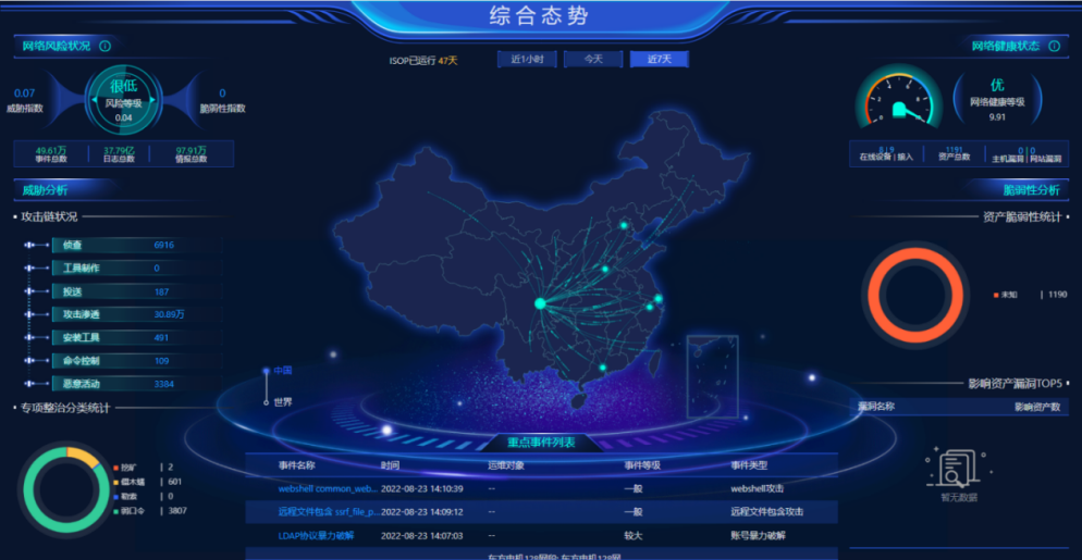 網絡安全態勢感知平臺上線運行,網絡資產底數更加清晰,實現對網絡安全威脅的全面監控,圍繞“及時發現漏洞、及時有效處置漏洞”兩個關鍵,實時發現并處置網絡風險、攻擊,動態調整安全策略。
