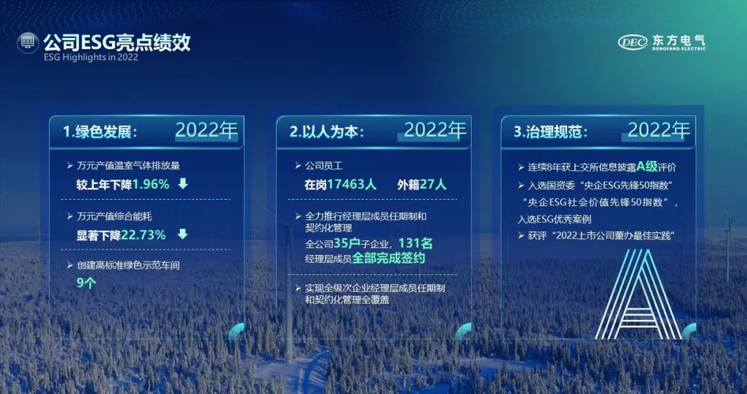 2022年,東方電氣緊抓行業發展機遇、沉著應對挑戰,全力服務構建新型能源體系,有力推動生產經營持續向好。全年實現營業總收入553.53億元,同比增長15.76%;歸屬于母公司股東的凈利潤28.55億元,同比增長24.71%;加權平均凈資產收益率為8.43%,比上年同期增加1.23個百分點。在業績增長的同時,公司持續增進股東回報,擬向全體股東每10股派發現金紅利3.35元,總計派發約10.45億元,分紅比例同比上年提升5.26個百分點,充分彰顯“共創價值,共享成功”的企業價值觀。