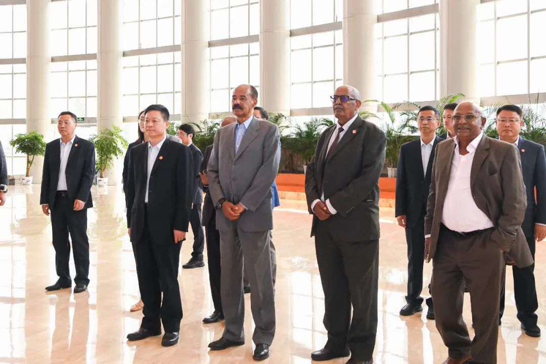 東方電氣科技展示廳前,東方電氣青年代表排列整齊,熱情揮舞著中厄兩國國旗,熱烈表達著對伊薩亞斯一行的歡迎之情。