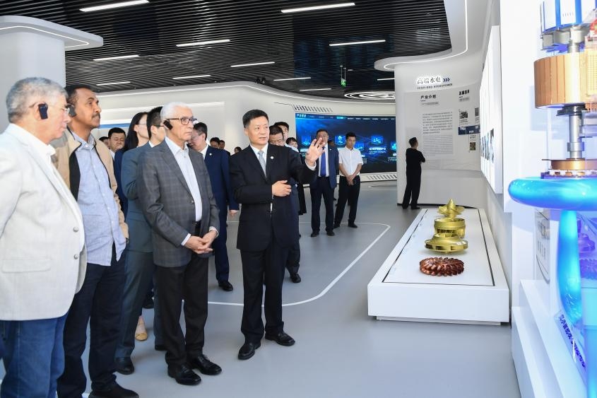 在俞培根等陪同下,阿拉米一行參觀了東方電氣科技展示廳,詳細(xì)了解東方電氣集團(tuán)科技創(chuàng)新、綠色裝備制造、共建“一帶一路”等方面情況。阿拉米對(duì)東方電氣集團(tuán)在能源領(lǐng)域所取得的成就表示祝賀。