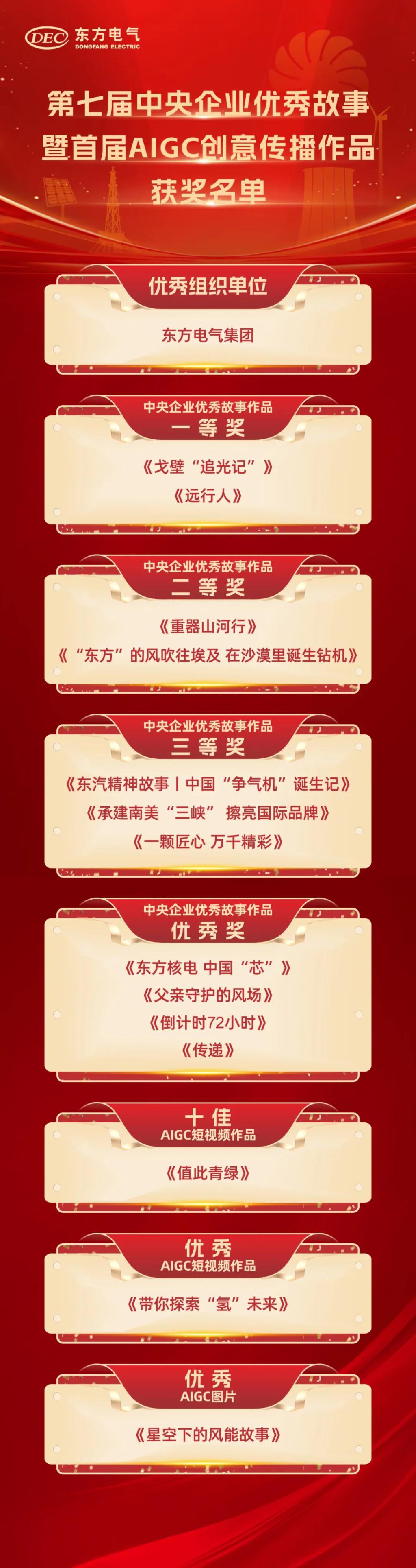 其中,《戈壁“追光記”》《遠(yuǎn)行人》榮獲中央企業(yè)優(yōu)秀故事作品一等獎(jiǎng),《重器山河行》《“東方”的風(fēng)吹往埃及 在沙漠里誕生鉆機(jī)》榮獲中央企業(yè)優(yōu)秀故事作品二等獎(jiǎng),《東汽精神故事丨中國(guó)“爭(zhēng)氣機(jī)”誕生記》《承建南美“三峽”擦亮國(guó)際品牌》《一顆匠心 萬(wàn)千精彩》榮獲中央企業(yè)優(yōu)秀故事作品三等獎(jiǎng),《東方核電 中國(guó)“芯”》《父親守護(hù)的風(fēng)場(chǎng)》《倒計(jì)時(shí)72小時(shí)》《傳遞》榮獲中央企業(yè)優(yōu)秀故事作品優(yōu)秀獎(jiǎng),《值此青綠》獲評(píng)十佳AIGC短視頻作品,《帶你探索“氫”未來(lái)》獲評(píng)優(yōu)秀AIGC短視頻作品,《星空下的風(fēng)能故事》獲評(píng)優(yōu)秀AIGC圖片。