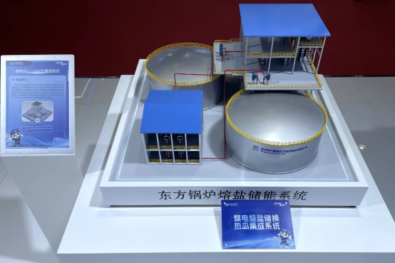 東方電氣熔鹽儲換熱島集成系統也尤為引人注目。該系統可將煤電機組富余蒸汽、谷電、新能源棄風棄光等多種能源形式轉化為熔融鹽顯熱進行存儲,在需要能源供給時輸出高參數工業蒸汽外供、推動汽輪機發電或帶動背壓機熱電聯產,對于構建綠色工業園區、提升煤電機組靈活性、促進新能源消納、支撐新型電力系統建設具有重要示范意義。目前,該系統已成功應用于國能宿州熱電解耦、物產環能桐鄉智慧低碳供能、中能建酒泉300兆瓦壓縮空氣儲能等項目。