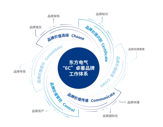“6C”卓著品牌工作體系立足高端裝備制造行業(yè)實(shí)際,以實(shí)現(xiàn)“品牌卓著”為目標(biāo),聚焦東方電氣品牌價(jià)值,由品牌價(jià)值選擇(Choose)、品牌價(jià)值識(shí)別(Certificate)、品牌價(jià)值創(chuàng)造(Create)、品牌價(jià)值傳遞(Communicate)、品牌價(jià)值管控(Control)、品牌價(jià)值提升(Consolidate)六個(gè)部分組成,闡述展示企業(yè)從品牌價(jià)值選擇到識(shí)別、創(chuàng)造、傳遞、管控,推進(jìn)價(jià)值提升的螺旋進(jìn)階的邏輯過程,致力為“中國(guó)產(chǎn)品”向“中國(guó)品牌”躍升提供系統(tǒng)解決方案。